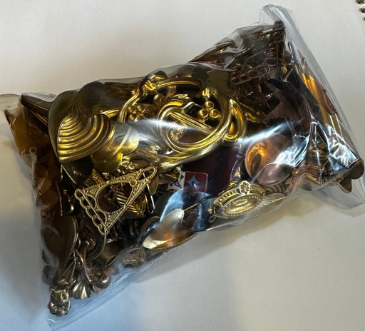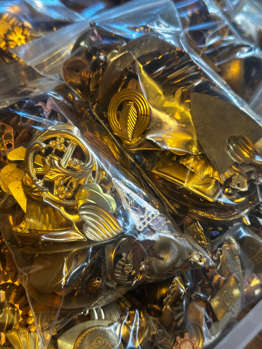 Packed with brass, copper, and enameled stampings from the swinging 1960s to the funky 1980s, these 4x6 inch bags weigh between 14 ounces and a f...