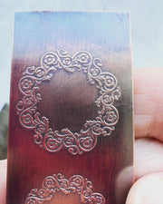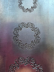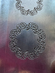 A rolling mill plate, with four different sizes of the floral wreath. The designs are 15, 20, 25, and 30 mm in size. The plate measures 45 mm x 100 mm aproximately